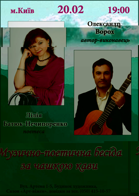 Запрошуємо Вас 20 лютого (четвер) на творчий вечір яскравої київської поетеси Лілії Батюк-Нечипоренко та автора-виконавця Олександра Вороха.